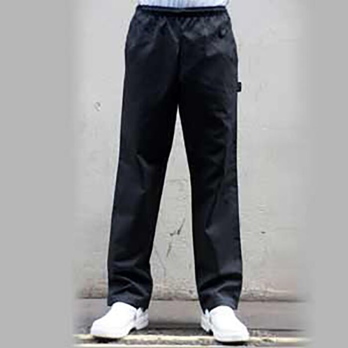 Dennys fully elasticated black chef’s trousers without a pocket.