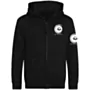 Soft cotton faced fabric. Brushed back fleece. Double fabric hood. No drawcord to comply with EU regulations. Full length covered zip. Front pouch pockets. Ribbed cuffs and hem. Twin needle stitching. Tear out label.